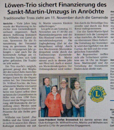 Dem Lions Club Anröchte – Warstein – Rüthen ist es ein Anliegen, dass kulturelles Brauchtums erhalten bleibt. Daher stellten im Jahr 2023 die für die für die Durchführung des Sankt Martins Umzugs in Anröchte notwendige Infrastruktur und sicherten die Finanzierung.